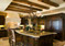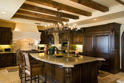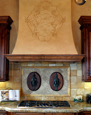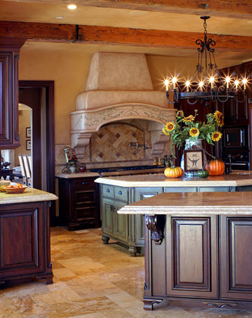 Tuscan style kitchen with aged hood design and two tone cabinets.