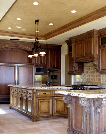 Two tone kitchen with distressed finish on island and textured ceiling & crowm.