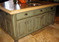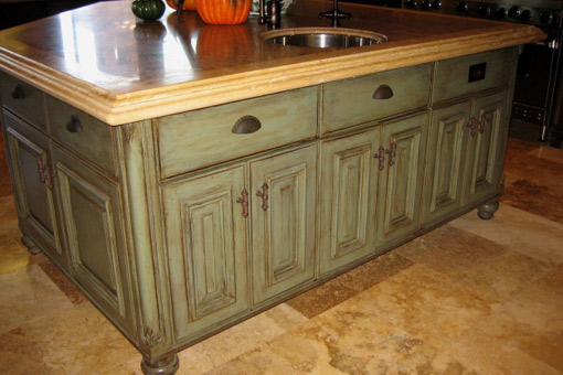 Kitchen island with a distressed and rubbed back paint / stain finish.