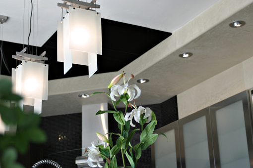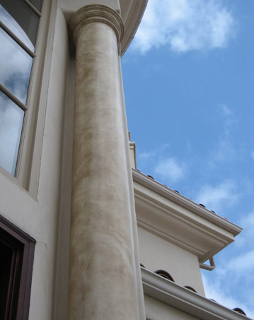 Marmorino plaster faux stone concrete block on kitchen soffit.
