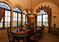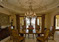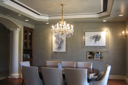 Dining room with burgandy faux finish ceiling and custom crown design.