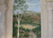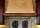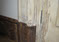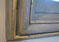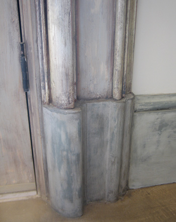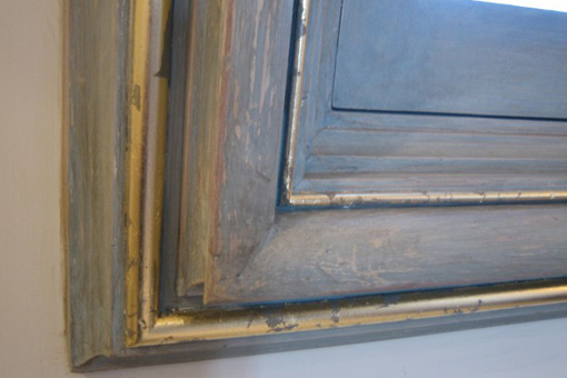 Custom window frame with antiqued white gold leaf and distressed french grey finish.